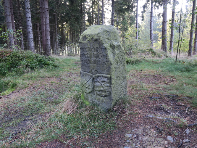 Der Grenzstein Nr. 167 von 1728 trennte das Herzogtum Sachsen-Meiningen (linke Ansicht) vom Fürstentum Schwarzburg-Rudolstadt (rechte Ansicht). Der Grenzstein steht zwischen