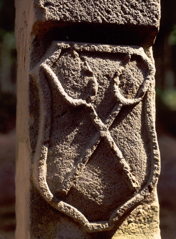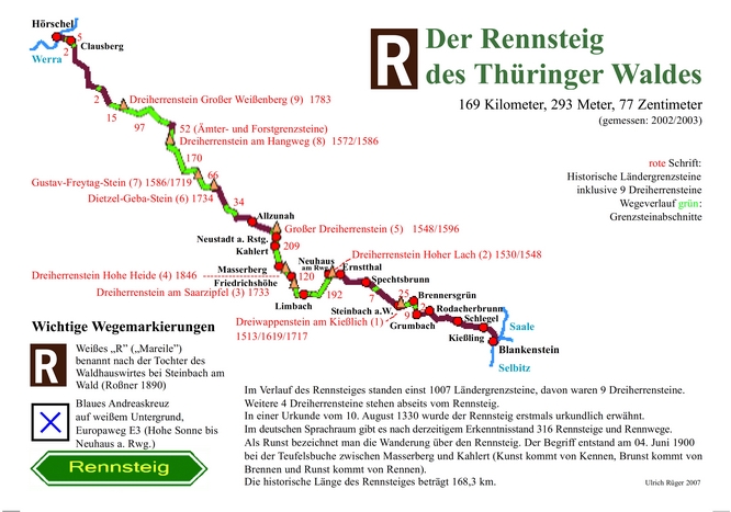 "...Damit man aber den Rennsteig nicht verfehlen möge, welcher zuweilen in Holzwege und Hauptstraßen eintritt, mit ihnen auch dann und wann ein Stück Weges fortgehet, ferner aber auch wiederum abweichet, so ist, wie mich der Fst. S.-Hildb. Oberförster... zu Unter-Neubrunn, Herr Martin Nees, belehret hat, der mehrere Teile des Rennsteigs von Hessen aus bis ans Hochgräflich- Reußische mit hohen gehauenen Sandsteinen besetzet, und stehet allzeit ein Stein diesseits zur rechten, forthin der andere zur linken Hand, auf jeder Seite aber des Landesherren Wappen und die Jahreszahl. Wo aber Malbäume mitunter stehen, sind solche mit einem Kreuz X und drei Hieben auf diese Art durchgehend bemerket..."